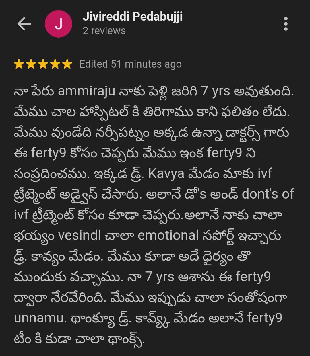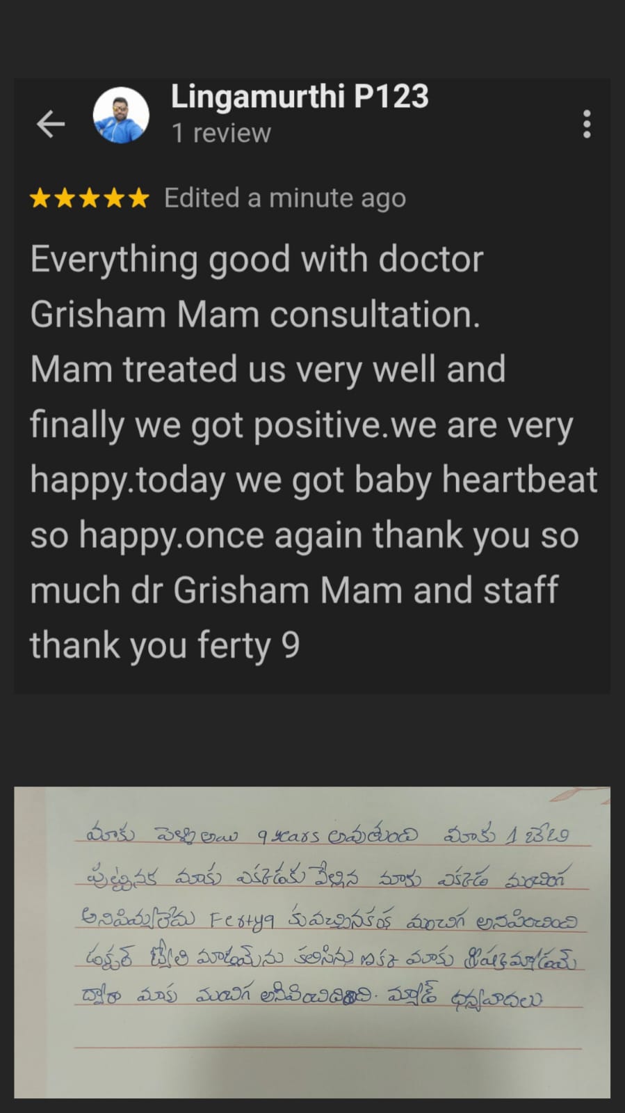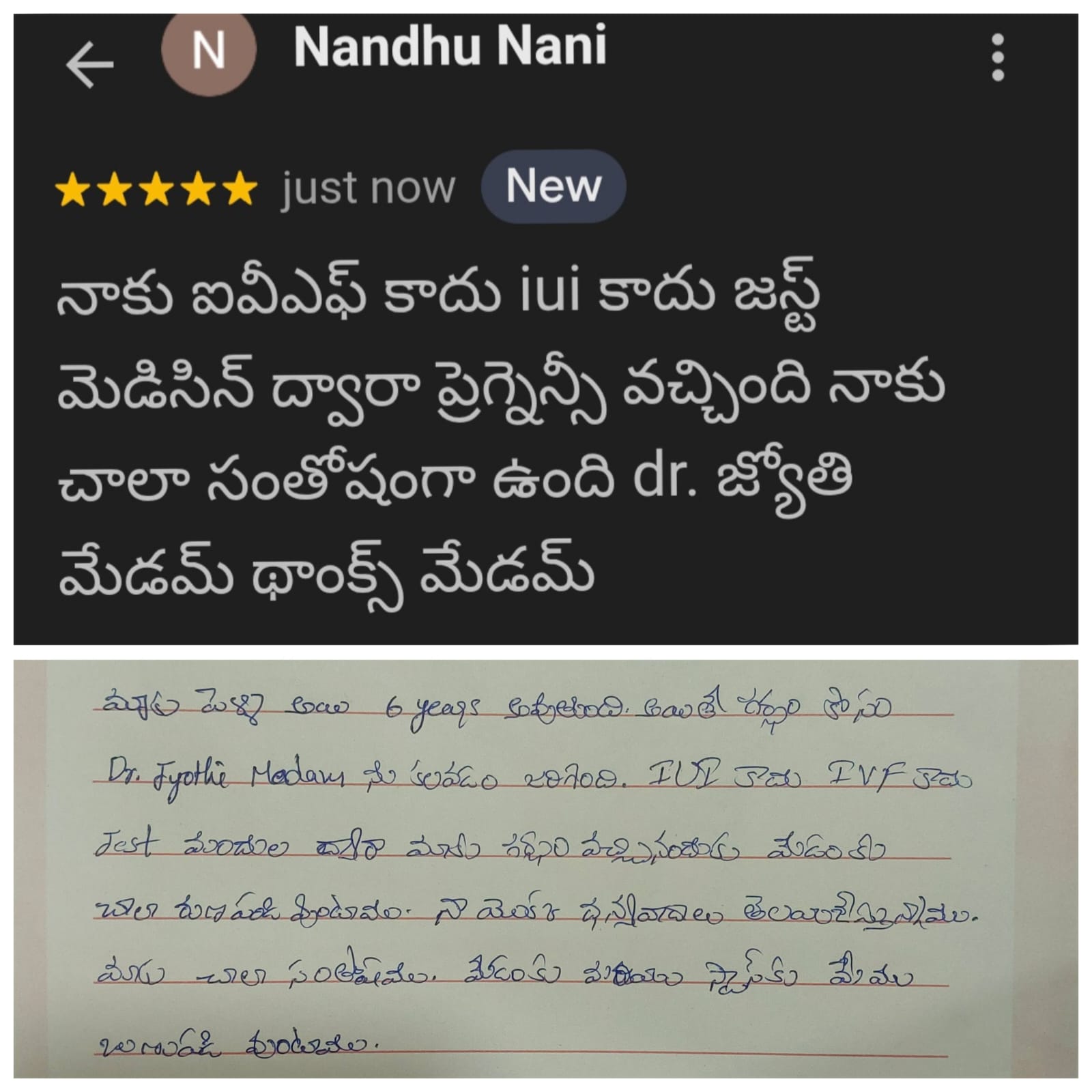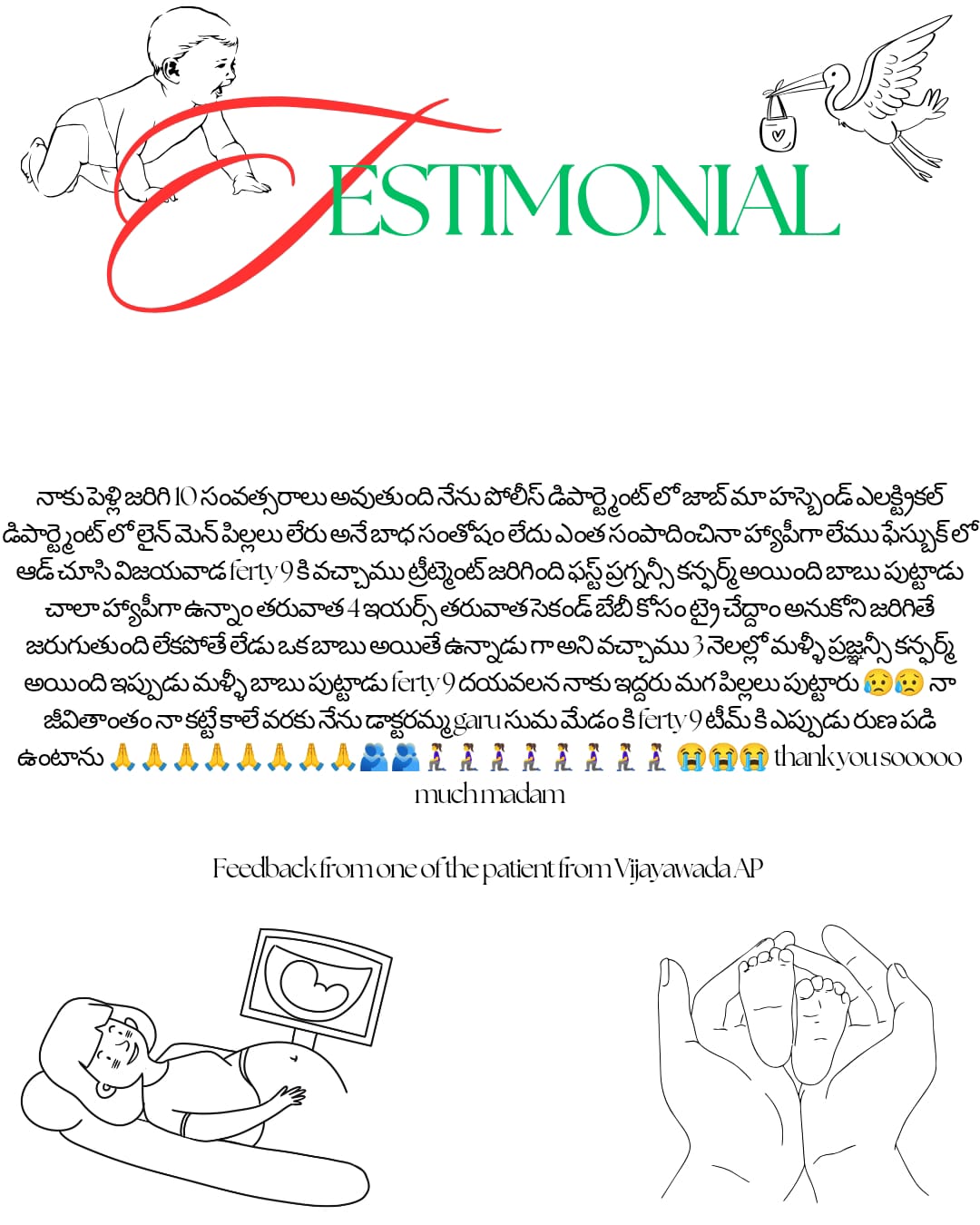 కన్నీటి మునుగులు తో మా జీవితం గడుస్తున్న సందర్భలో డాక్టర్ గారు మా జీవితంలో వెలుగు కాంతి లాగ వచ్చారు. 9 సంవత్సరాల మాకు పిల్లలు లేక ఆవేదనలో ఉన్నాము డాక్టర్ గారు చేసిన వైద్యంలో గర్భం దాల్చుతున్నాము డాక్టర్ గారికి మా కుటుంబ సభ్యులంతా హృదయపూర్వక కృతజ్ఞతలు తెలుపుతున్నాము.