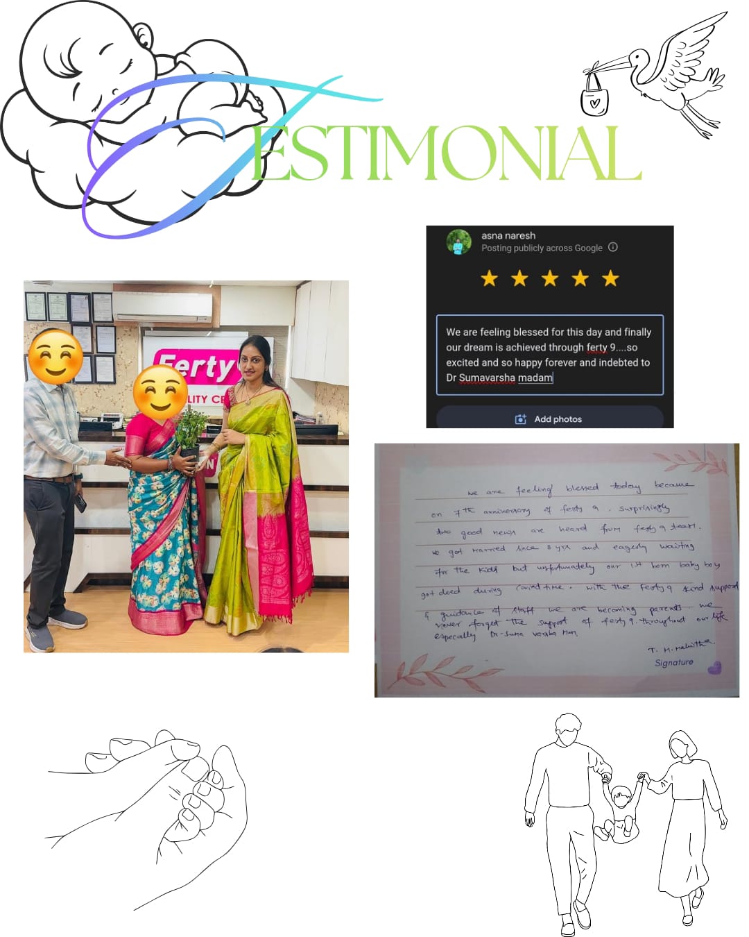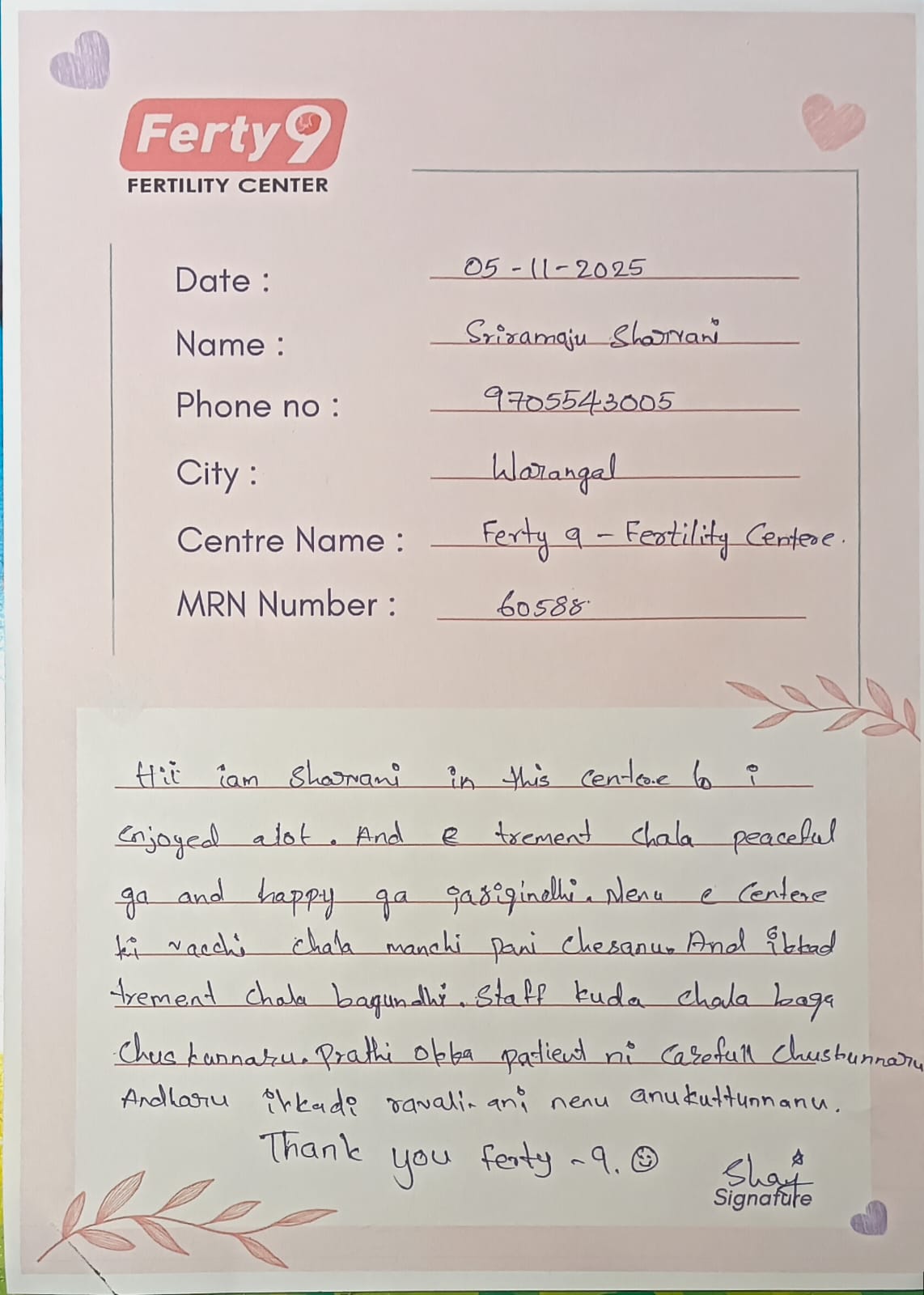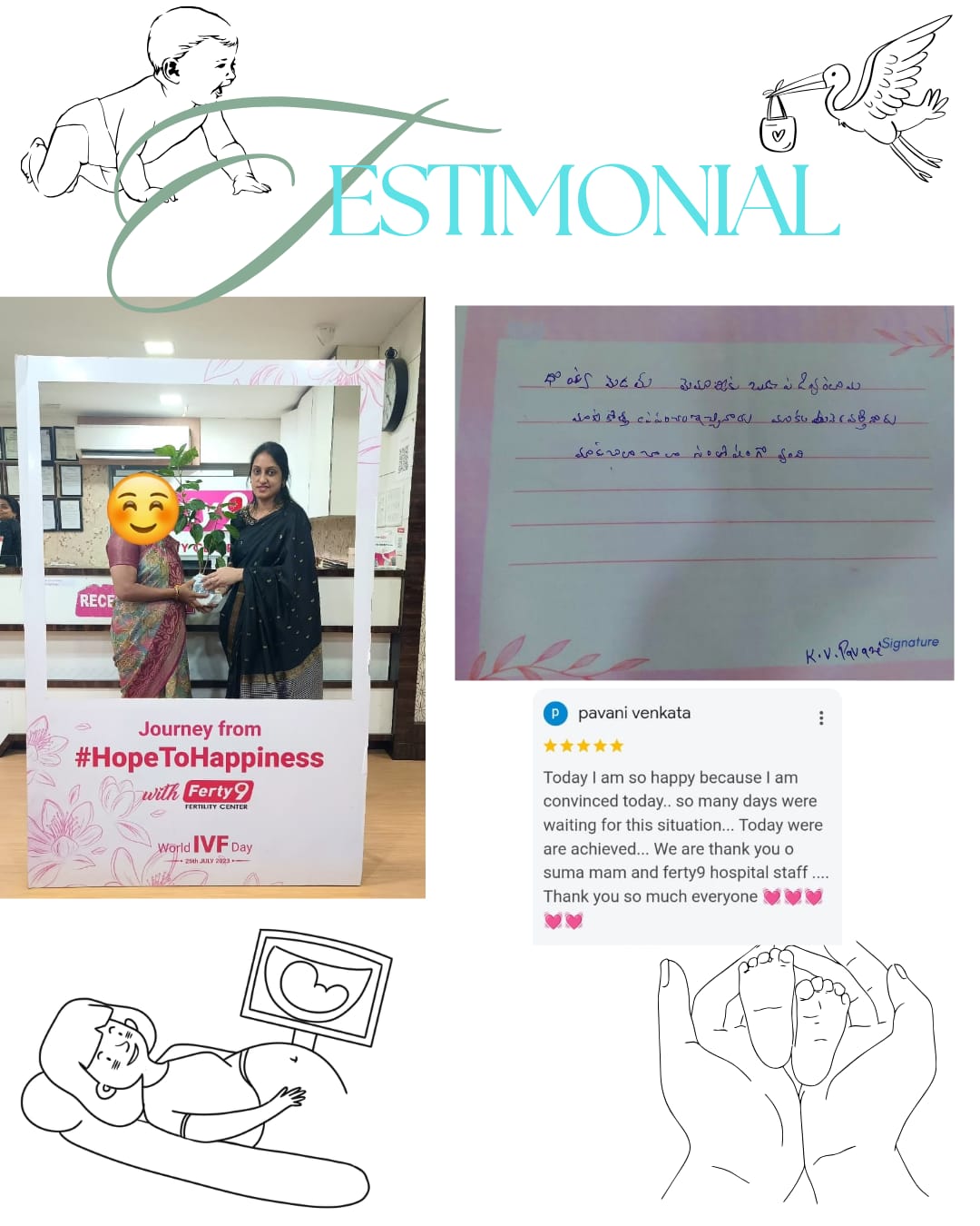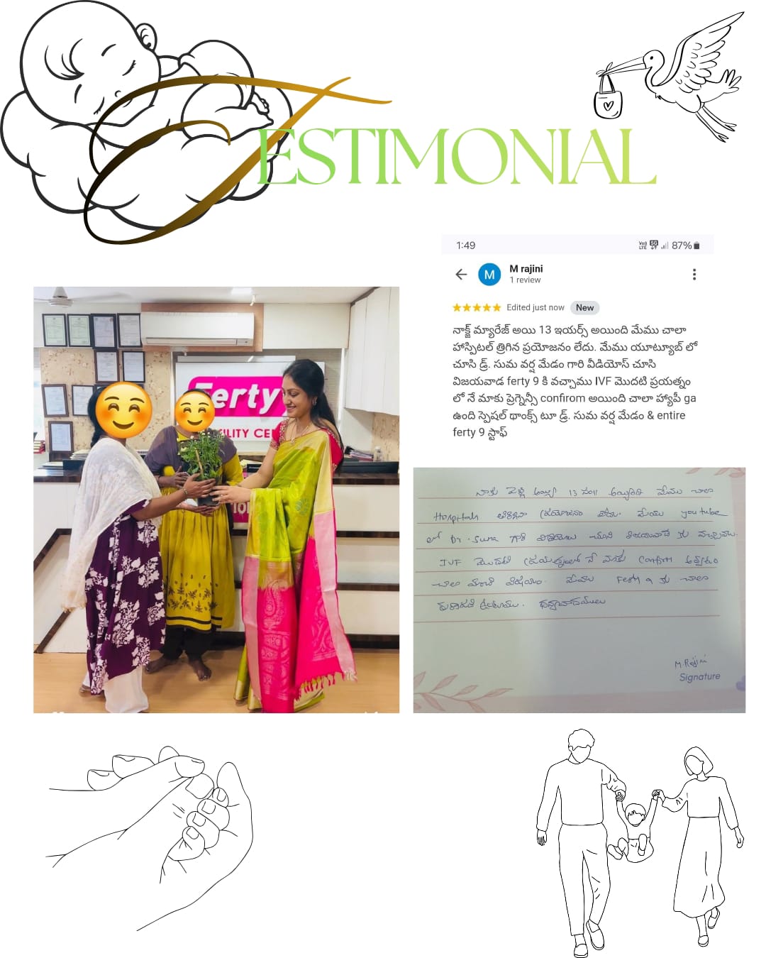 “Pittala Anusha / Naresh Kumar — We got married in 2020. For the last 4 years, we visited many hospitals for fertility treatment, but there was no result. Recently, we visited Ferty9, and within 3 months my wife got pregnant. So, heartfelt thanks to Suma Madam and all the staff.”