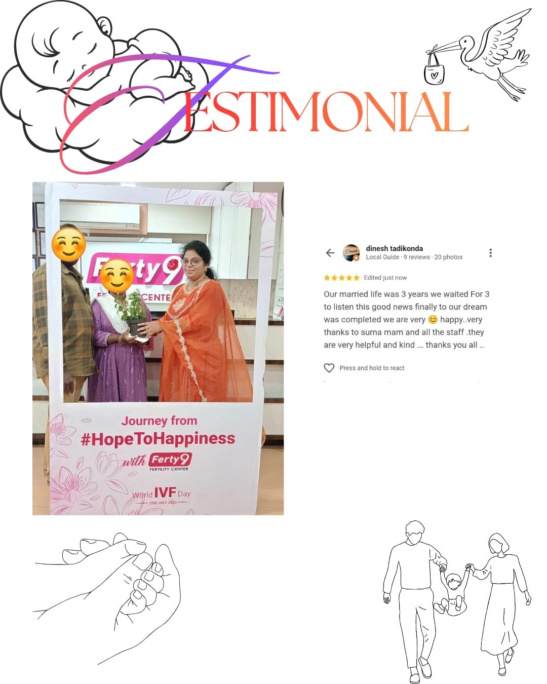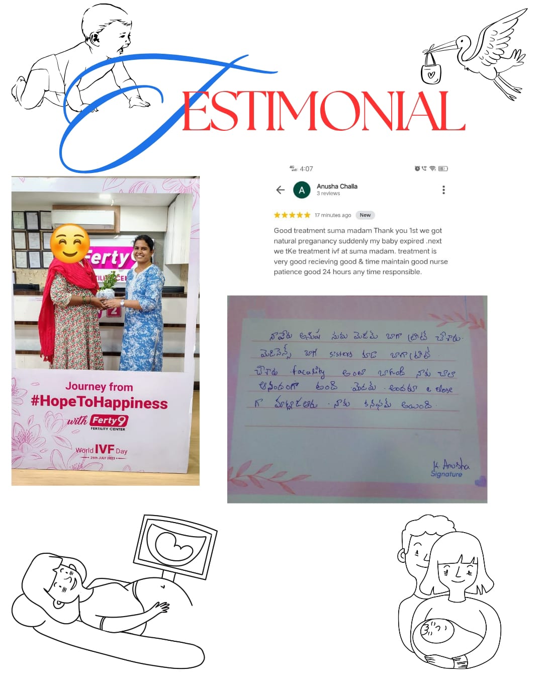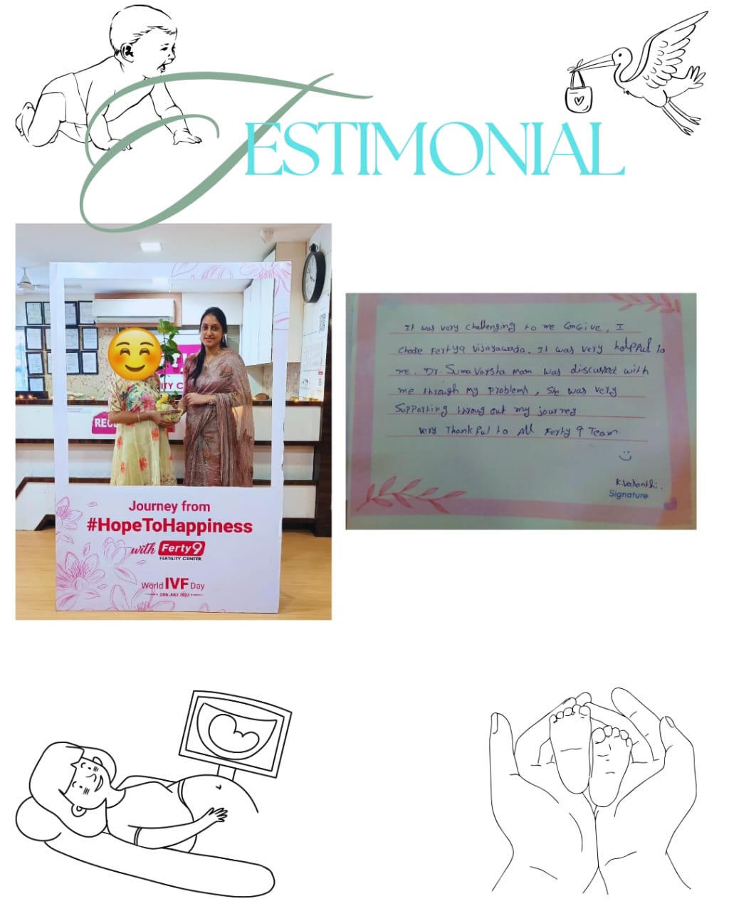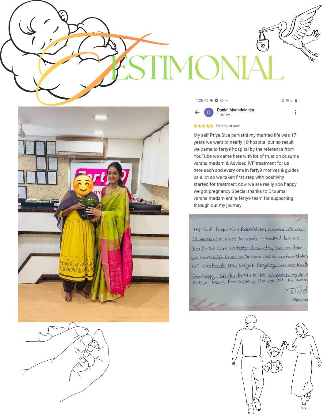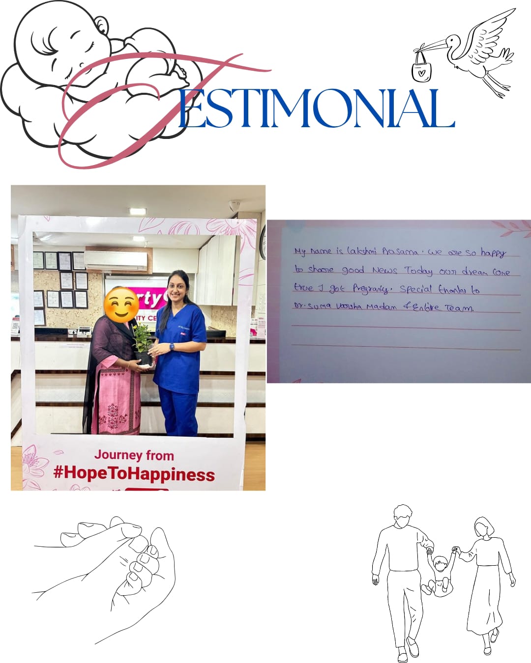 నా పేరు లక్ష్మి. నాకు వివాహం అయి 20 సంవత్సరాలు అవుతుంది. చాల హాస్పిటల్స్ తిరిగాను కానీ ఫలితం లేదు. ఫర్టీ 9 హాస్పిటల్ కి వచ్చిన 2 నెలల్లోనే పాజిటివ్ వచ్చింది. సుమా మేడమ్ మరియు స్టాఫ్ అందరూ చాలా బాగా సపోర్ట్ చేశారు. చాలా సంతోషంగా ఉన్నాను. థాంక్యూ సుమా మేడమ్ మరియు టీం.