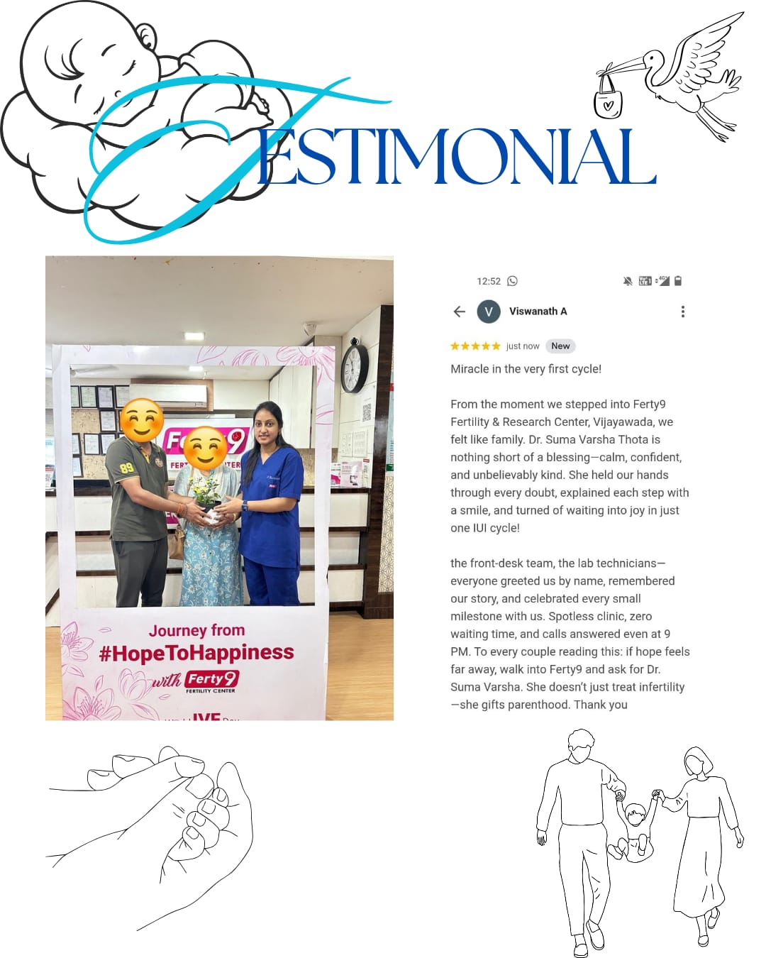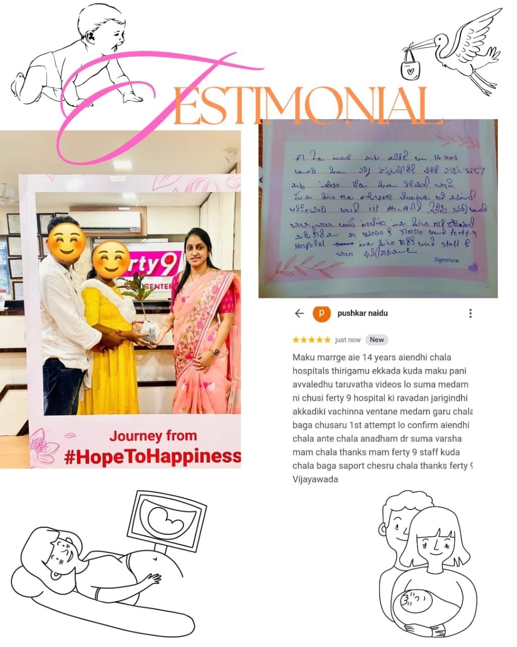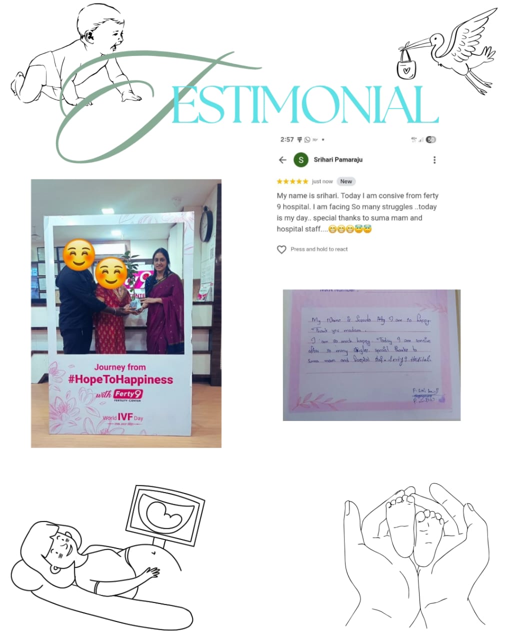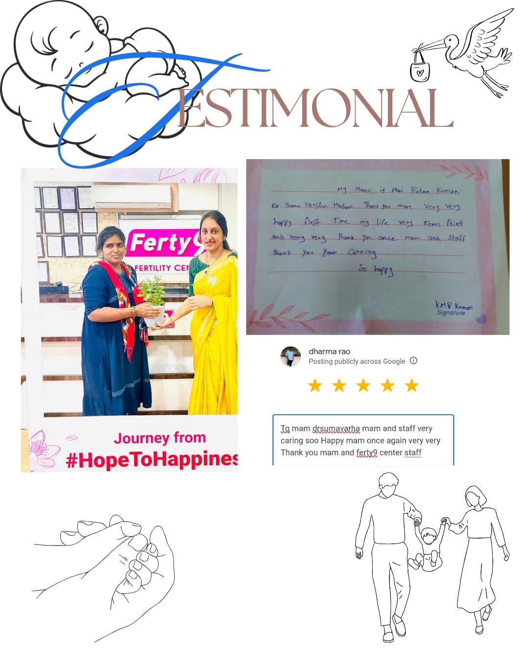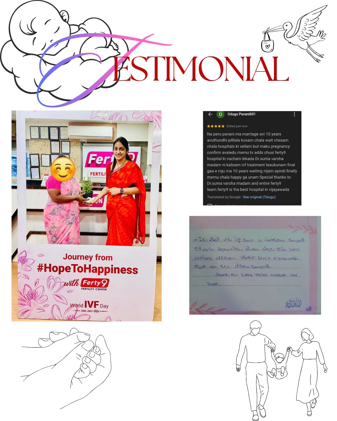 నా పేరు లక్ష్మి. నాకు వివాహం అయి 20 సంవత్సరాలు అవుతుంది. చాల హాస్పిటల్స్ తిరిగాను కానీ ఫలితం లేదు. ఫర్టీ 9 హాస్పిటల్ కి వచ్చిన 2 నెలల్లోనే పాజిటివ్ వచ్చింది. సుమా మేడమ్ మరియు స్టాఫ్ అందరూ చాలా బాగా సపోర్ట్ చేశారు. చాలా సంతోషంగా ఉన్నాను. థాంక్యూ సుమా మేడమ్ మరియు టీం.